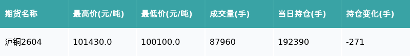 南财智讯3月12日电,盘后期货数据显示,上海期货交易所的沪铜主力合约收跌0.51%,十大杠杆炒股平台收盘报101010.0元/吨,日内资金流出6521.55万元。其他相关指标见下表: